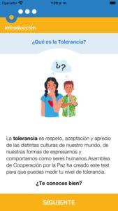 Esta aplicación tiene por objetivo evaluar el nivel de tolerancia de estudiantes en su medio social. El test está compuesto por dieciocho preguntas que permiten conocer el nivel de tolerancia en la sociedad desde una perspectiva global, buscando favorecer el ejercicio de una ciudadanía crítica y comprometida con la construcción de una sociedad justa y equitativa.
